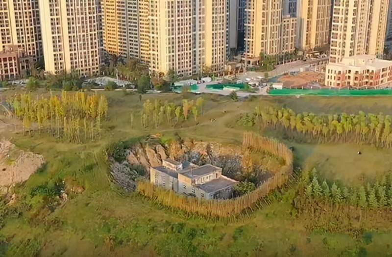 有一戶這樣的人家,房子是兩棟三層小樓,并排建在一起,如今房子周邊已經是一片綠化帶,更奇葩的是,房子被10米高的土墻四面圍住,以至于從地面上看過去,很難發現房子的存在,只有在空中航拍,才能讓房子露出真面目。