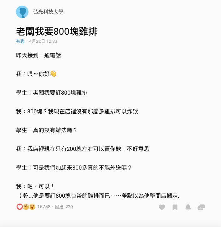 根據報導,有位在雞排店打工的網友,日前在「Dcard」上分享上班時遇到的趣事,表示店裡某天接到了一通來自學生的訂餐電話,劈頭就說:「老闆我要訂800塊雞排!」瞬間讓原PO感到非常驚訝,只好再次確認「要800塊?」而得到對方肯定的答案後,就無奈表示:「現在店裡沒有那麼多雞排可以炸欸!」