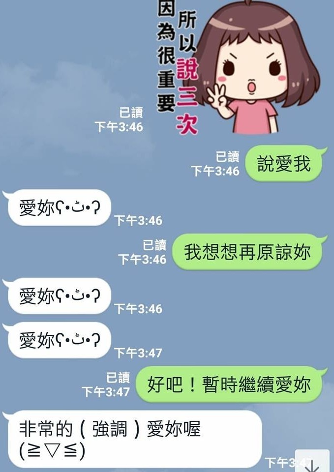 原本應該會一觸即發的戰火,在這一來一往的幽默對話澆熄了!最後還是抵不住女兒的瘋狂撒嬌,終於舉白旗投降說「好吧!暫時繼續愛你!」