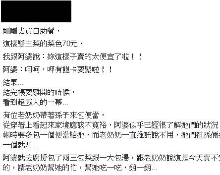 不過婆婆只是笑著跟他說:「有吃飽比較重要啦!」讓網友大讚真的是最佛心的店家之一,不過更讓人感動的是,就在他要踏出店門口的時候,遠遠就看到有一名老奶奶,帶著孫子要來包便當,似乎和老闆也熟識,結帳的時候老闆就要多包一個給對方,讓奶奶直說:「不用啦,我們祖孫倆共吃一個就好!」